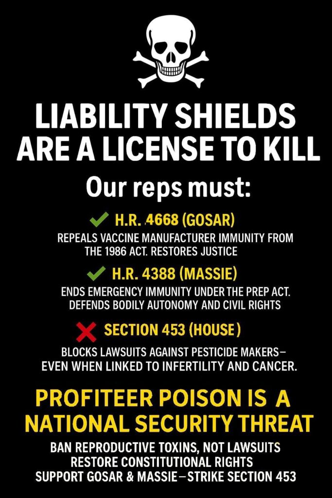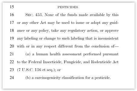 I write to formally object to the inclusion of Section 453 in the FY2025 Interior Appropriations Bill, which grants legal immunity to pesticide manufacturers. This provision constitutes a legislative rider that introduces new substantive law unrelated to the underlying purpose of the appropriations bill.