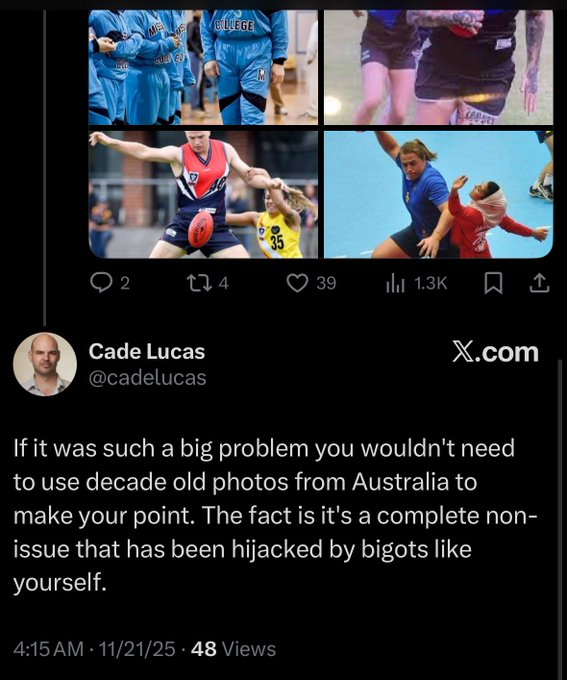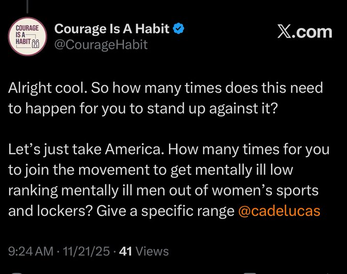 Cade fully supports mentally ill men in women’s sports but is too much of a coward to own it so he does the “It’s not happening that much” thing all pathetic males do.